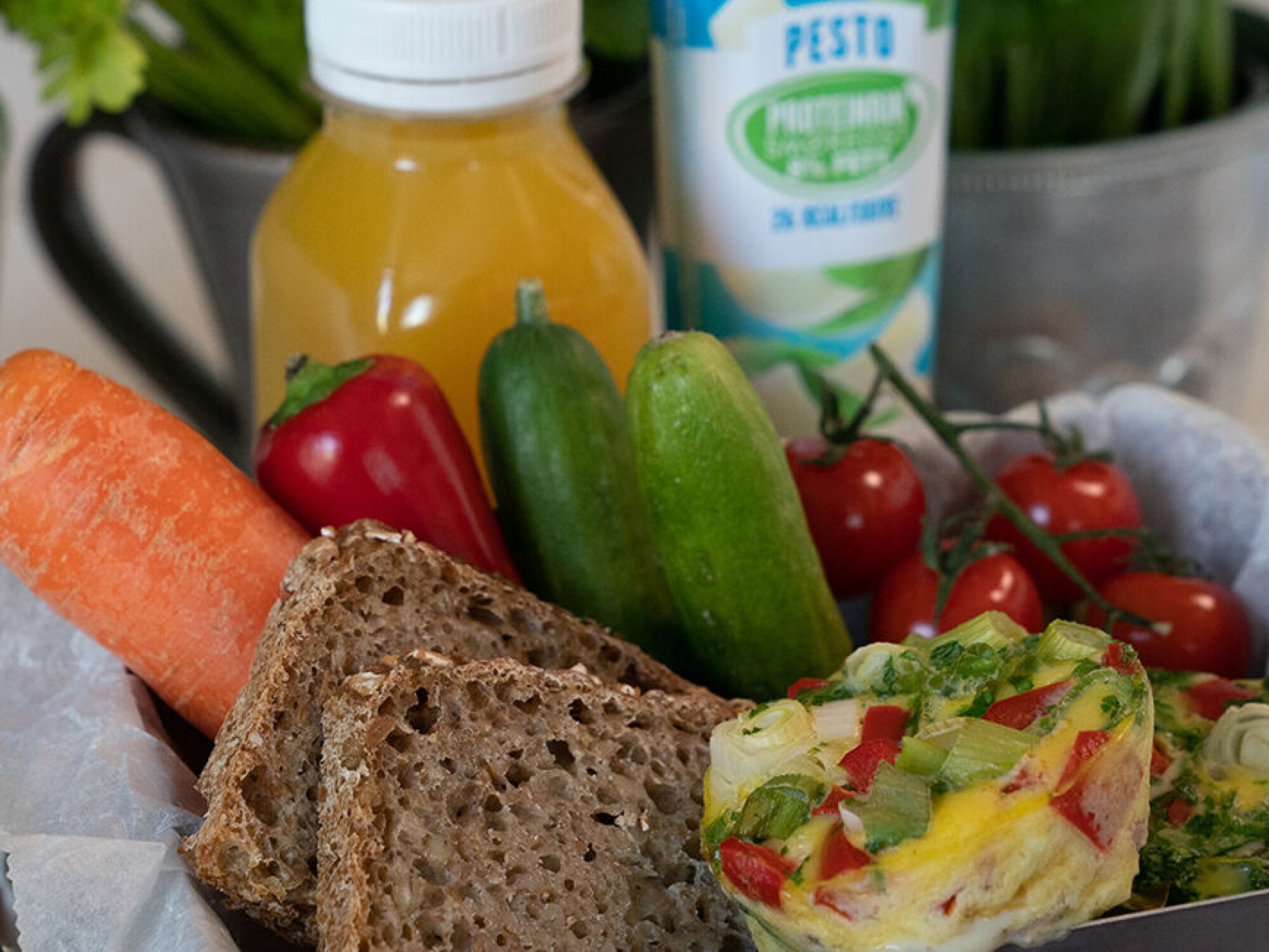 Næringsrike porsjonsomeletter lager du enkelt i muffinsformer. Visp sammen egg med litt salt og pepper, ha blandingen i former sammen med finhakkede grønnsaker (paprika og vårløk gir god smak), skinkebiter og en teskje med MagerOst Skinke, Pesto eller Jalapeño. Stek i ovnen, avkjøl og pakk ned i matboksen.