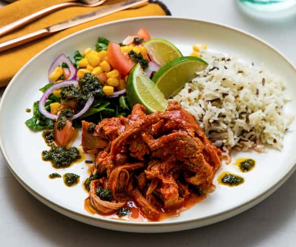 Krydret kyllinglårfilet med chilistekte grønnsaker, maiskrem og svart ris